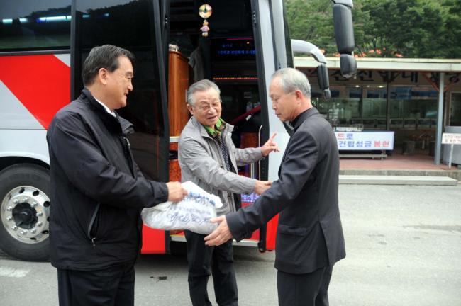 제주교구, 재속 프란치스코회 이태수 신부(변기영 몬시뇰 동창신부), 노형성당 주임 안명현 신부 외 80명 성지순례시, 성지주임 김학렬 신부님, 이태수 신부님깨 순례단들에게 나누어 줄 향나무 묵주 선물 전달(2012.10.05)